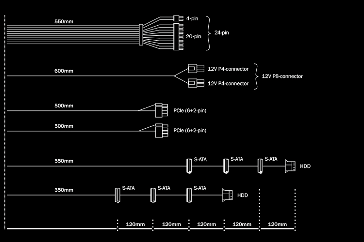 | Flat cables | P4+4 / PCIe / drives |