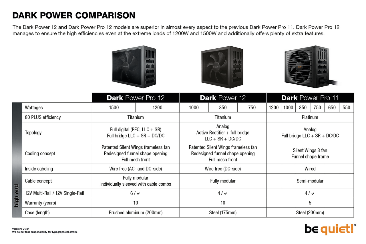 Dark Power 12 850W is certified with 80 PLUS Titanium and an energy efficiency rating of up to 95.6%. This provides lots of benefits for your high-end system, including less power consumption and an overall cooler and quieter operation. The standby drain is below 0.1 watts.